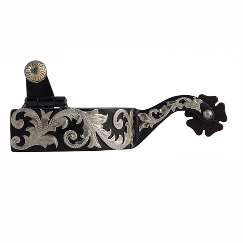 Black steel spur with a beautiful silver plate filigree overlay on band and neck