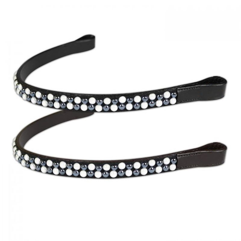 Browband for English bridle made of soft and high-quality leather, with two rows of synthetic pearls, white and black/blue. Very special to give a touch of style.