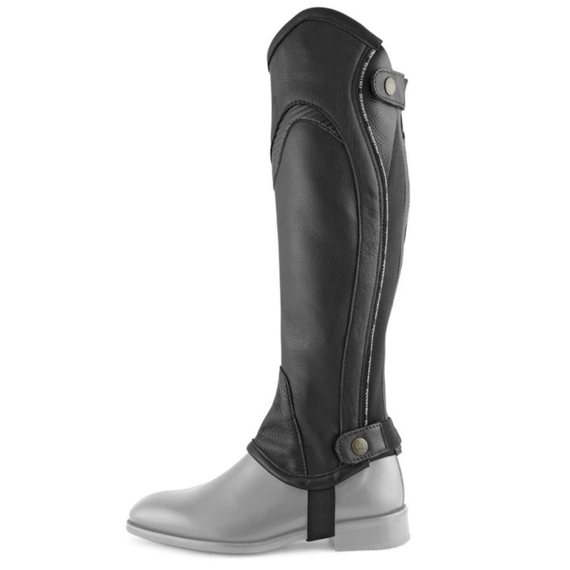 Piping shaped leather mini-chaps. Rear zip closure with elastic and button at the bottom.